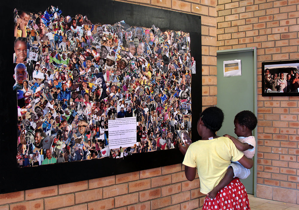 Themba shows off his prints. Do you recognize him? Themba was the boy who turned my camera on me three months ago. (See photo above.)Checking out the stunning photobook. I think the little boy in stripes is looking at a photo of himself.Thanks to Mark Straw – the driving force behind Joburg Photowalkers who introduced us to Diepsloot in the first place – there were computer screens rotating through the photos on a continuous loop.A young girl admires her print while checking out the collage in the hallway. The collage is made from 500 individual prints and was put together by the staff at the youth centre.