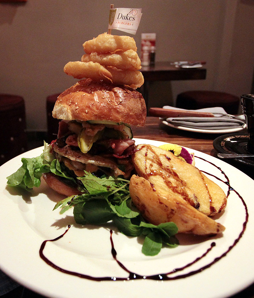 Dukes Burgers’ flagship menu selection: ‘The Dukes’. Beef patty, grilled pineapple, mushrooms, fried tomato, sunnyside-up egg, bacon, cheddar cheese, gherkins, cucumber ribbons, and onion rings. And potato wedges. Joe ordered this and ate most of it. He’s a brave man. He said it was great but he would have preferred less deep-fried stuff.