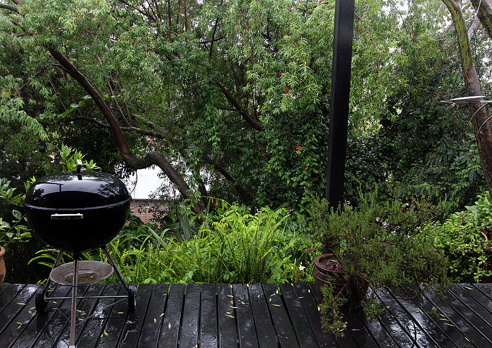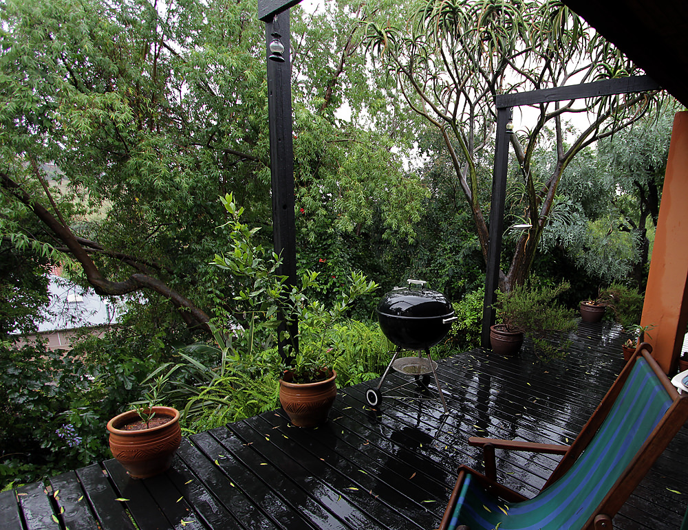 Here’s a shot taken from the deck, exactly a year ago during a summer rain storm. You can see a limb of the rock karee tree shooting off to the left. The other limbs are obscured by creepers.Another view of the back yard during the same rain storm in December 2010.[Christmas dinner](/2010/12/27/christmas-under-the-african-sun/ "Christmas Under the African Sun"), 2010. This gives you a nicer idea of what the private jungle felt like.