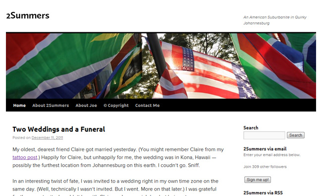 I loved my old header image of the South African and U.S. flags flapping in the wind. Joe shot the photo in Melville during the 2010 World Cup, just before I moved here. It was a unique image that communicated a lot about who I am and what my blog is about.