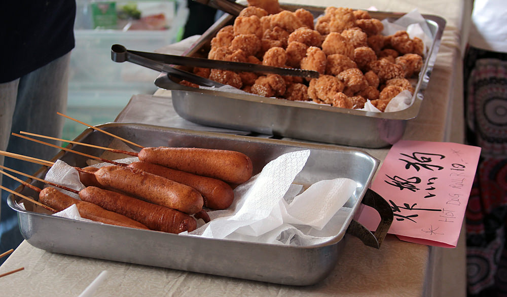 Corn dogs and mysterious fried bits. Just like at the county fair back home.