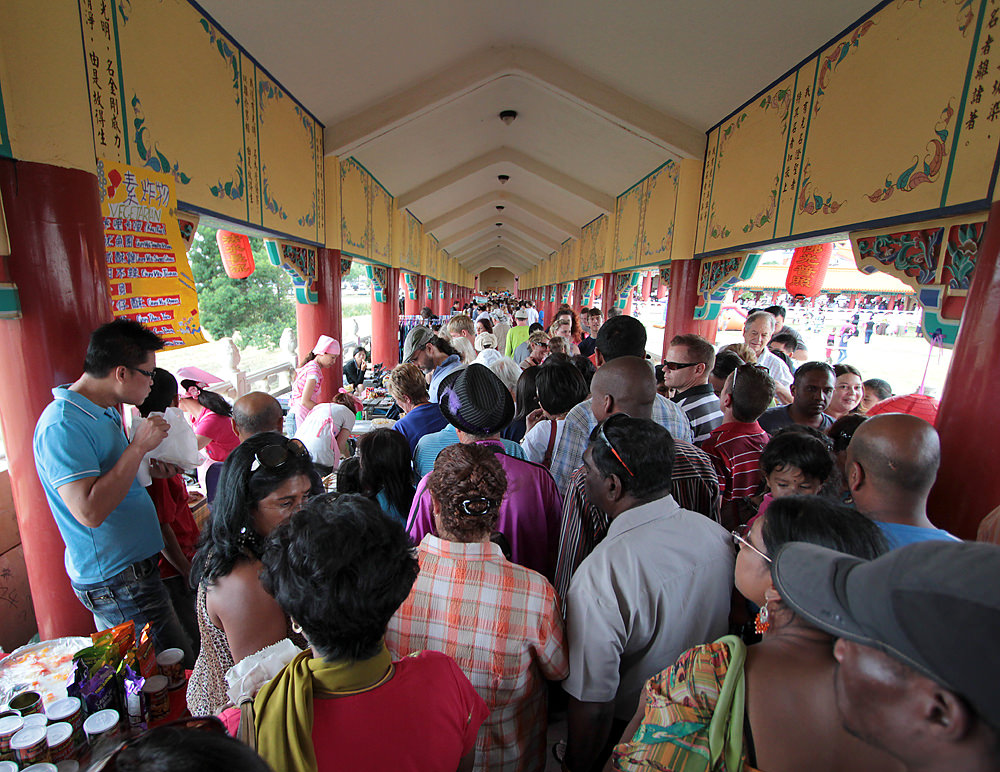 The imposing temple square is surrounded by a covered walkway, which was lined with stalls selling all kinds of food and Chinese trinkets.