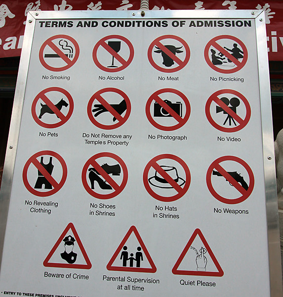 I found this sign hilarious. During the time I was inside the temple grounds I saw nearly every one of these rules being broken, many times over. “No Photo’, ‘No Video’, ‘No Meat’, ‘No Picnicking’, and of course ‘Quiet Please’ were the most frequently broken rules.