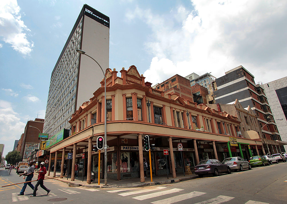 The area around Diagonal Street, a busy commercial district in the Joburg city centre, is a good illustration of worlds colliding. Stand in the middle of Diagonal Street and look up, and you’ll see this: