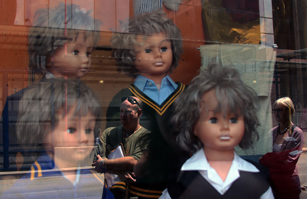 Tour guide Ishvara, reflected between creepy child mannequins modelling school uniforms.
