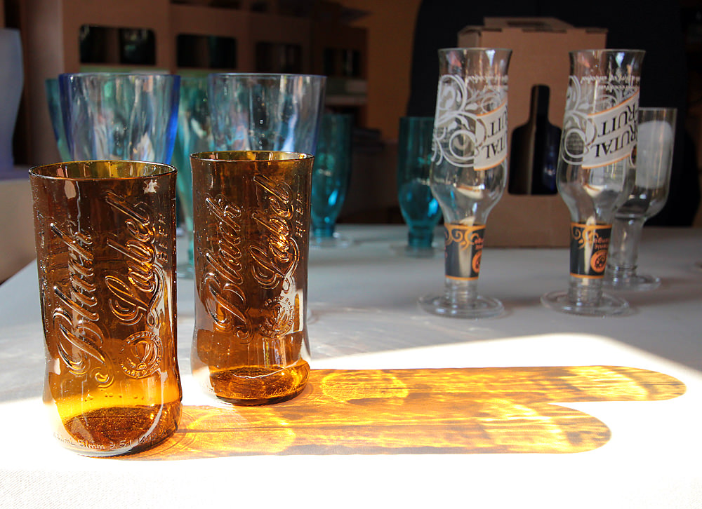 Recycled glassware (made of old Black Label beer bottles) from Green Glass filters the afternoon sunlight.