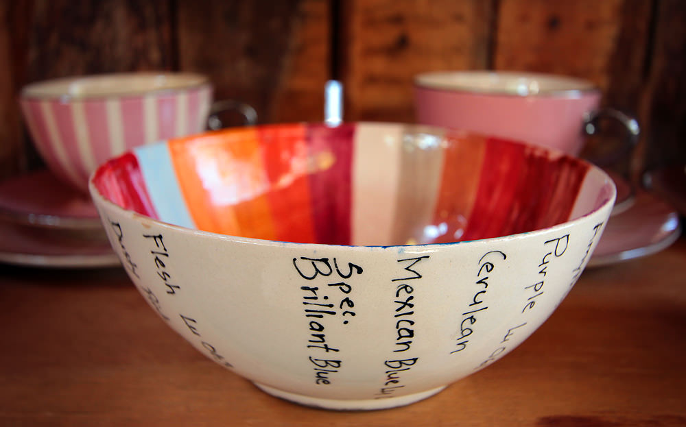 A ceramic bowl by artist Peter Mthombeni. The bowl showcases all of his ceramic colors on the inside, and the color names on the outside. Unfortunately this bowl is not for sale.