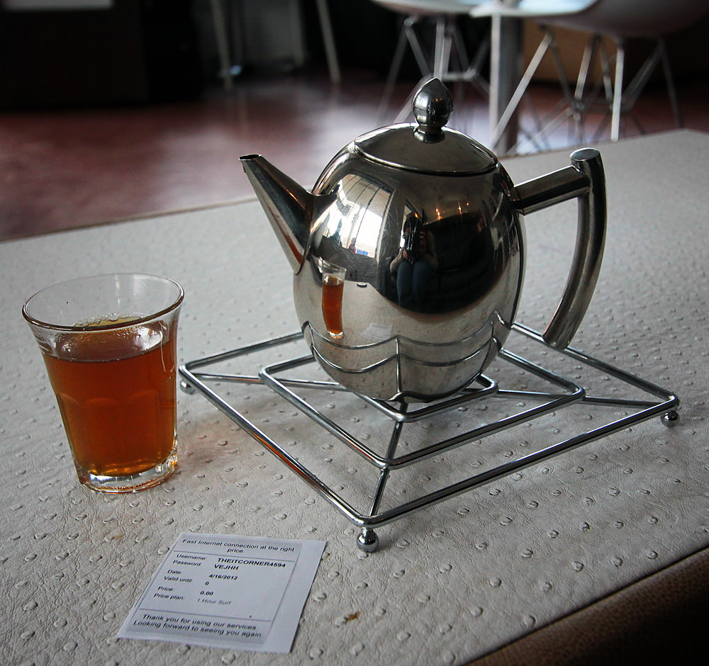 A small pot of Moroccan mint tea, and an internet voucher. These pots appear small, but they contain enough tea to sip for hours and they stay hot forever. A pot costs R17 (about $2), a small price to pay for a couple hours of speedy internet. Internet access is free – you just have to ask for a new voucher every hour.