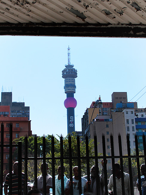 Spectators line up along the fence outside the gym, with the Hillbrow Tower looming behind.