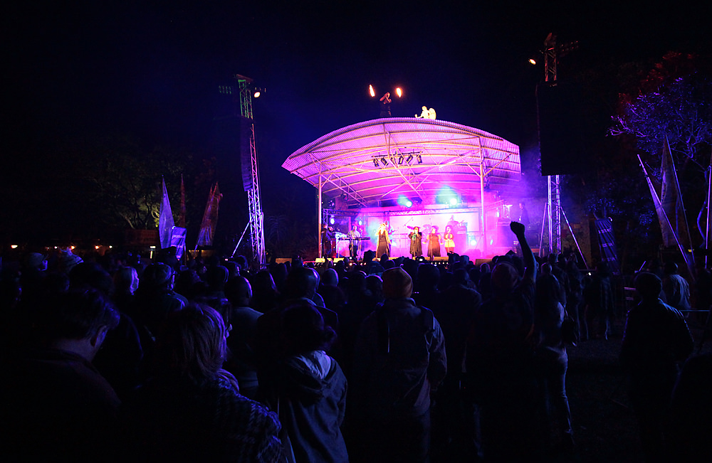 Night view of the Bushfire stage. I didn’t notice the fire dancer on the roof until I looked back at my photos.
