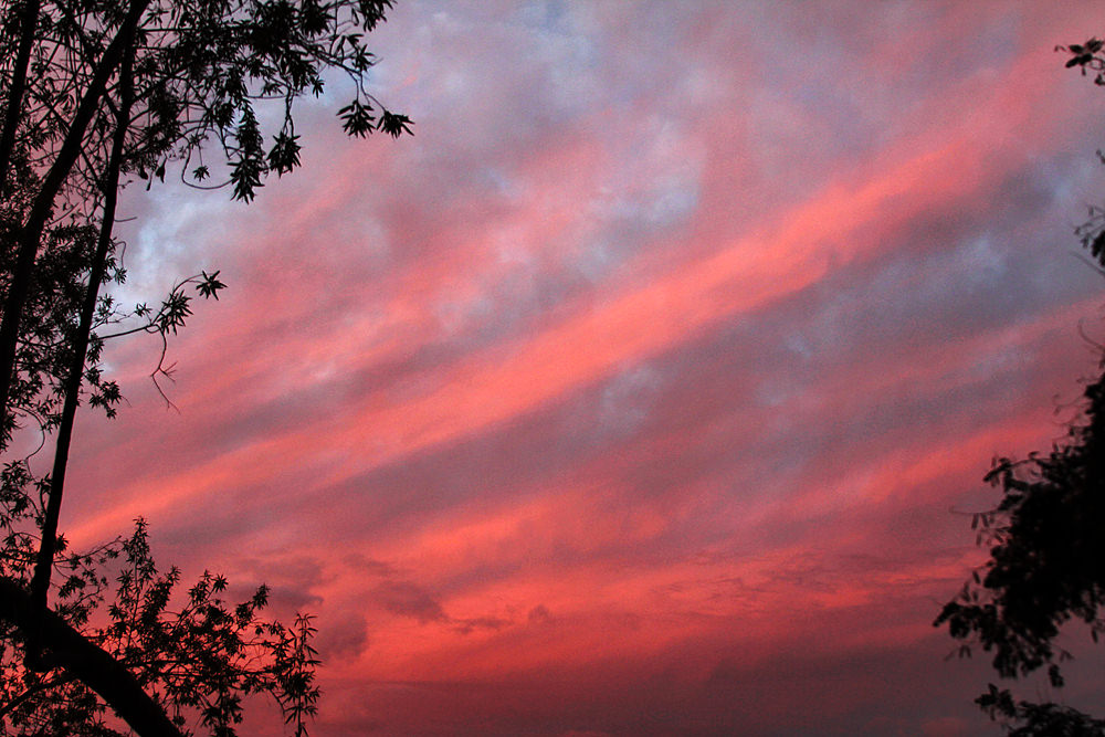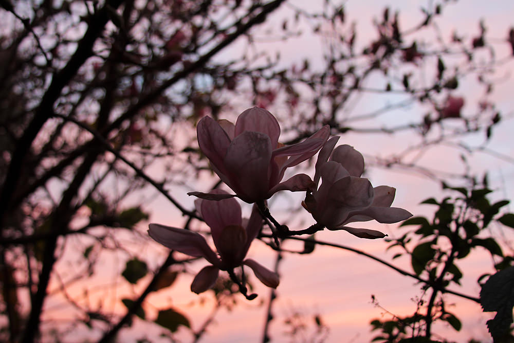 Pink sky and pink magnolias. For some reason, the magnolia tree at the Lucky 5 Star likes to bloom in winter. The tree is hemispherically challenged.