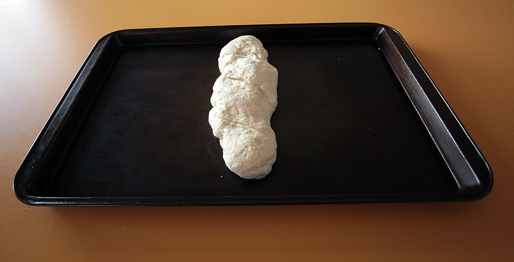 The next morning I punched down the dough. (That’s right. I punched it!) Then I kneaded it again, shaped it (badly), put it on a cookie sheet and let it sit for 20 minutes under a towel. Then I baked it for 30 minutes at 375°F.