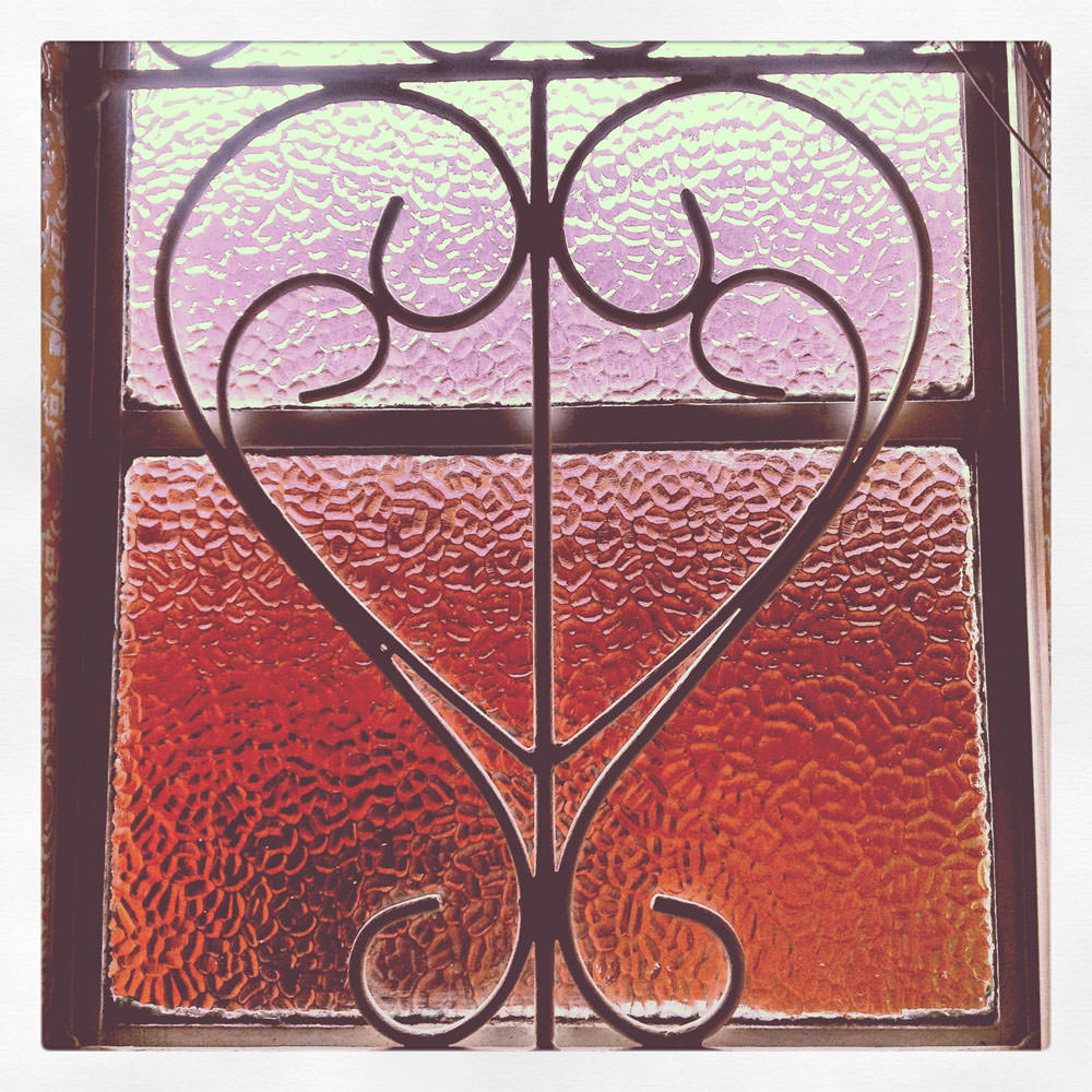 My bathroom window. Technically the window is covered by burglar bars. But I don’t think of these beautiful metal objects as burglar bars. To me, they’re art.