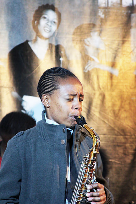 Alto sax player Linda Shabalala. I love the juxtaposition of the only female musician in the band with the poster of Dolly Radebe, one of Sophiatown’s most famous jazz singers. Unlike the guys in the band, who are all smiles and exuberance, Linda is all business.