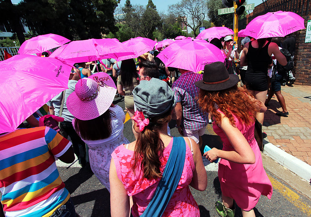 Dressed and ready for Joburg Pride. Although it’s not visible in the photo, I wore my mini-kilt. Unfortunately my kilt is not pink, but otherwise it was the perfect attire for a hot day of gay pride marching.
