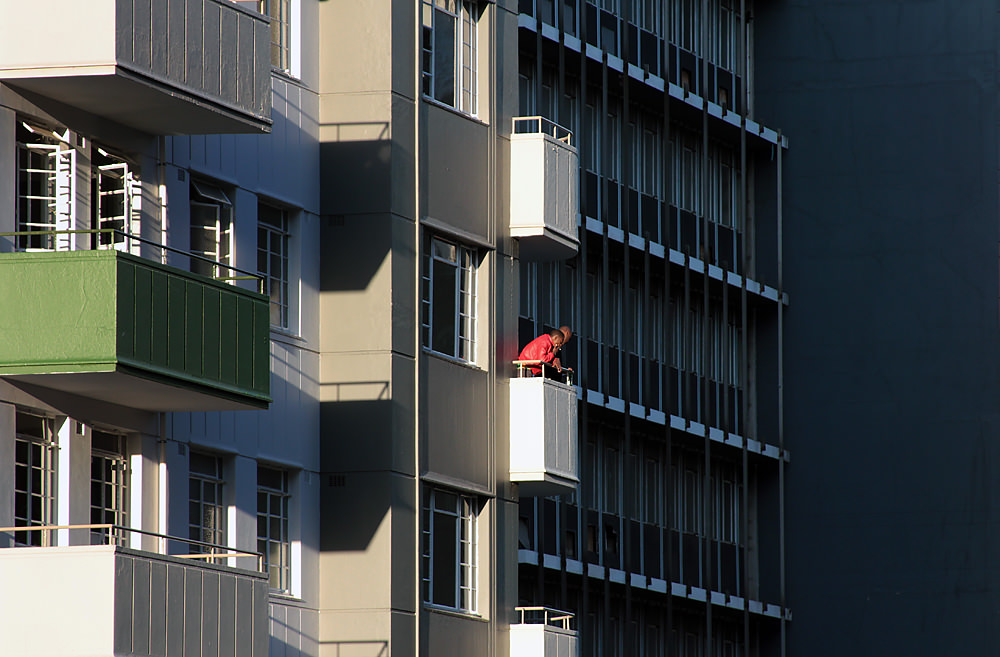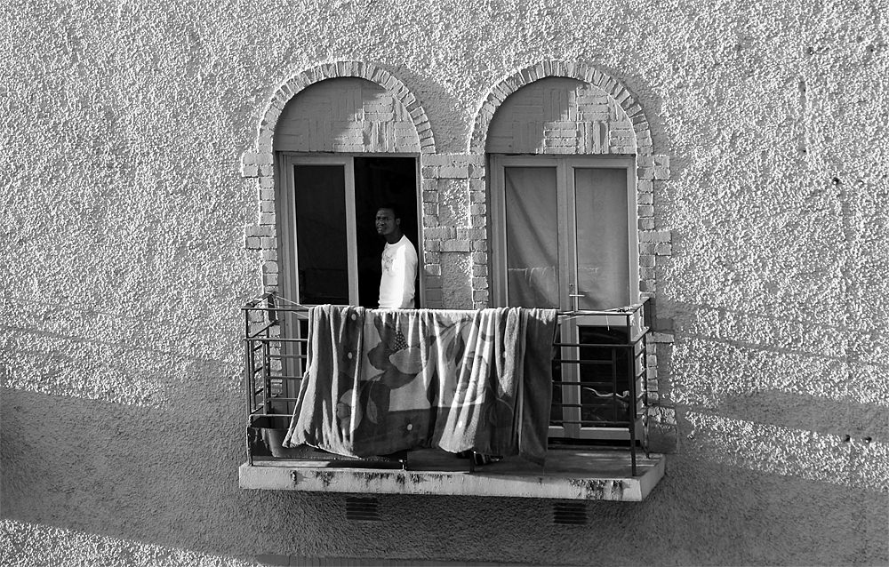Joubert Street above: Two men smoking quietly on the balcony of what looks to be a nicely renovated building.