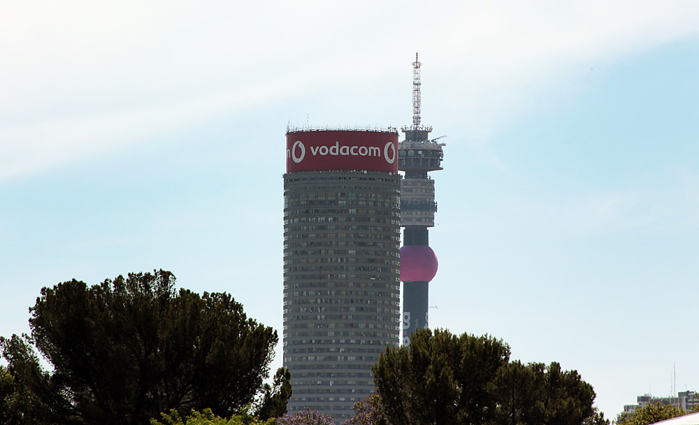 Ponte through the trees. The top of Ponte is an ad for Vodacom, South Africa’s biggest mobile communications company.