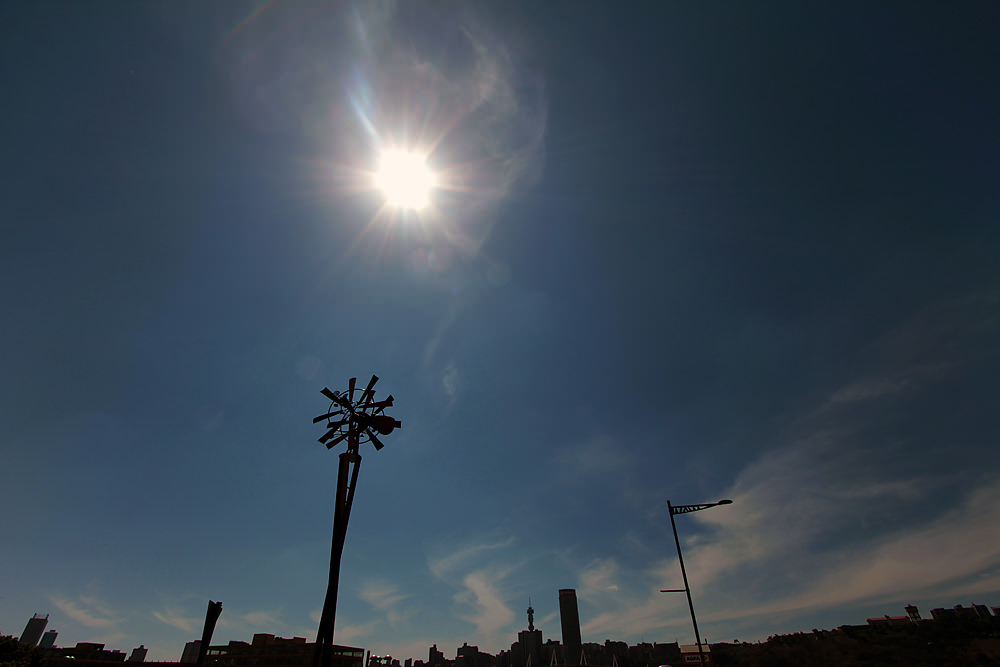 Wide-angle shot of a funky piece of public art on Bezuidenhout St. You can barely see the top of Hillbrow Tower behind another building.