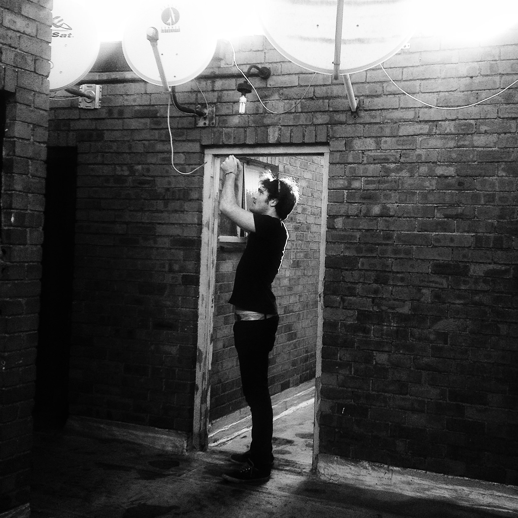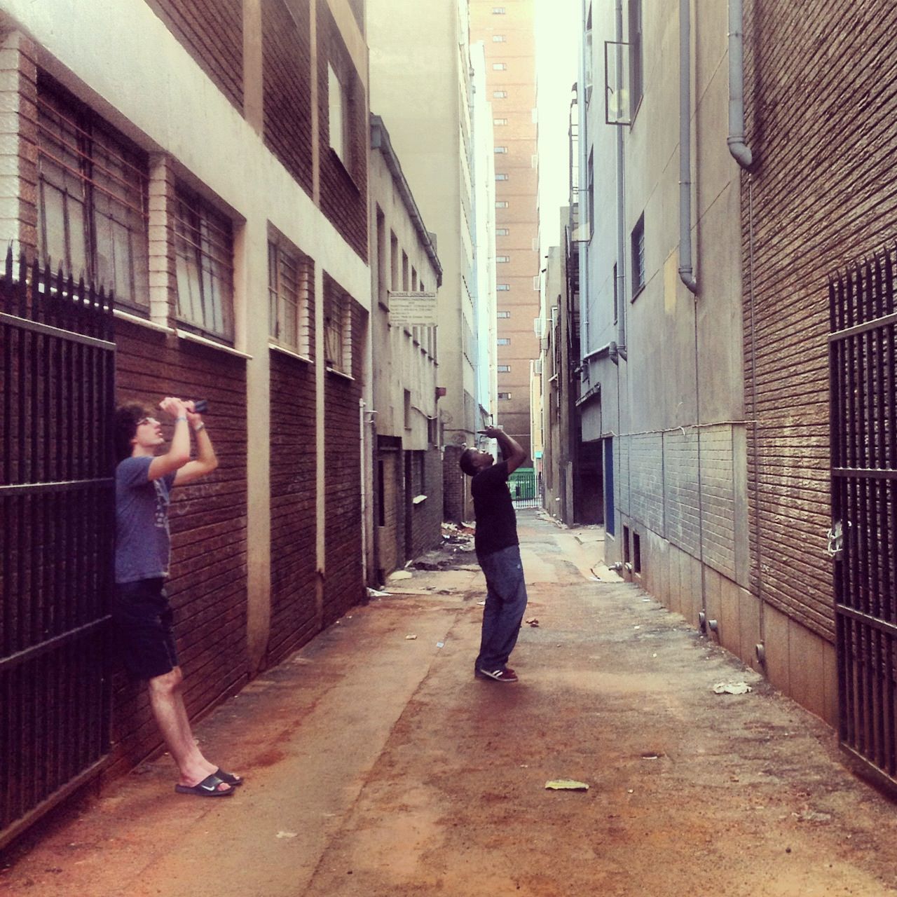 @hairyknees and @unclescrooch, shooting in a nearby alley after we came down off the roof.