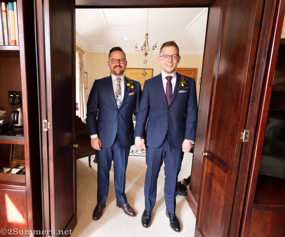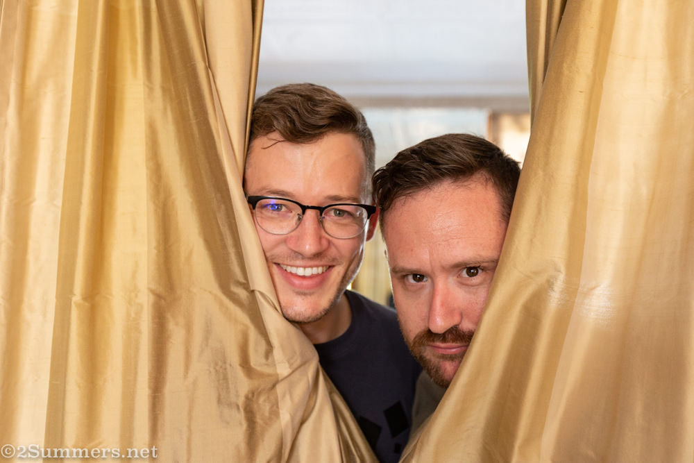 Guy (left) and Thomas, hiding behind the curtain just before they got dressed for the wedding.