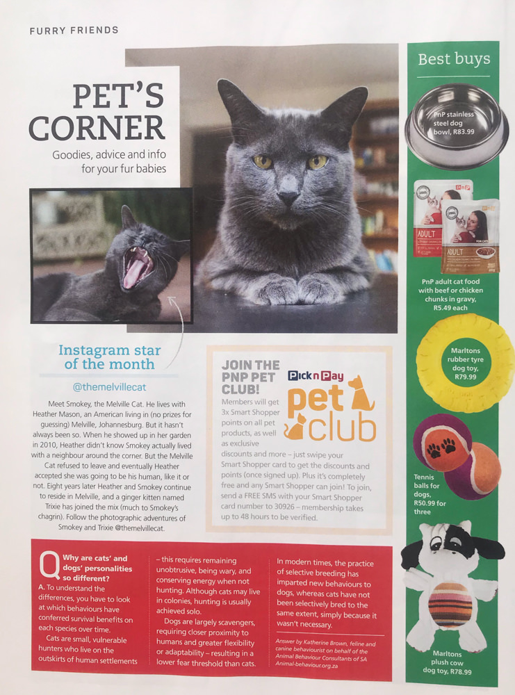 My magazine feature.The Midget was dismayed to learn that I, alone, am the Instagram Star (although she is briefly mentioned in the article text).Stop in to Pick n Pay this month for your own copy. Also, a reminder that you too can follow me (and the Midget) on Instagram at @themelvillecat.