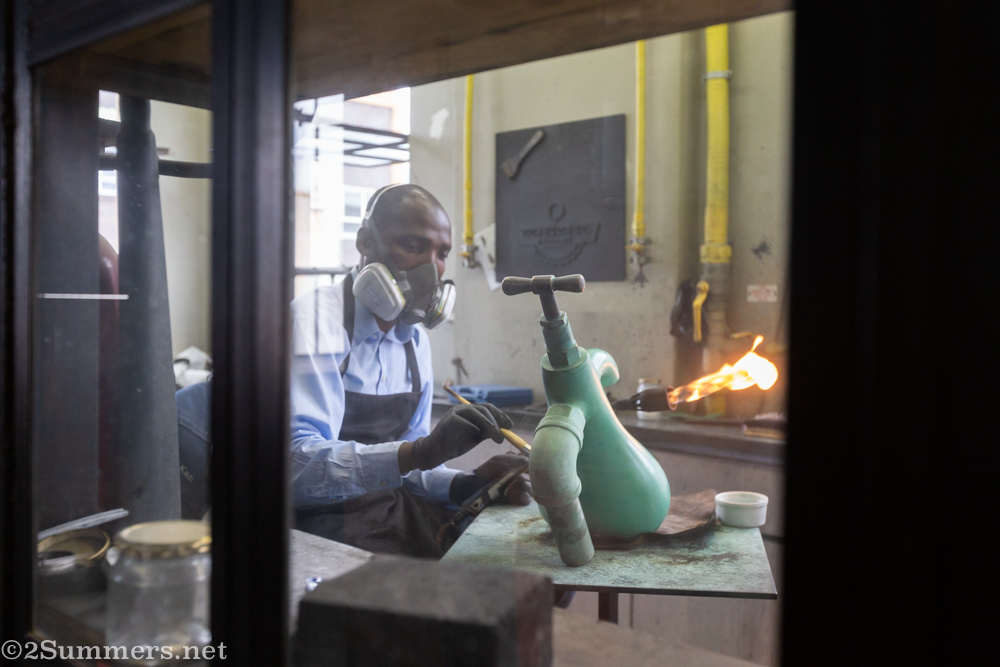 I don’t have any pictures of the molten metal part of the process because that wasn’t happening the day I went. But this is Mbongeni Qholani performing what is called fettling, when the moulding shell is removed, the pieces are all put together and the sculpture returns to the exact shape of the original model.