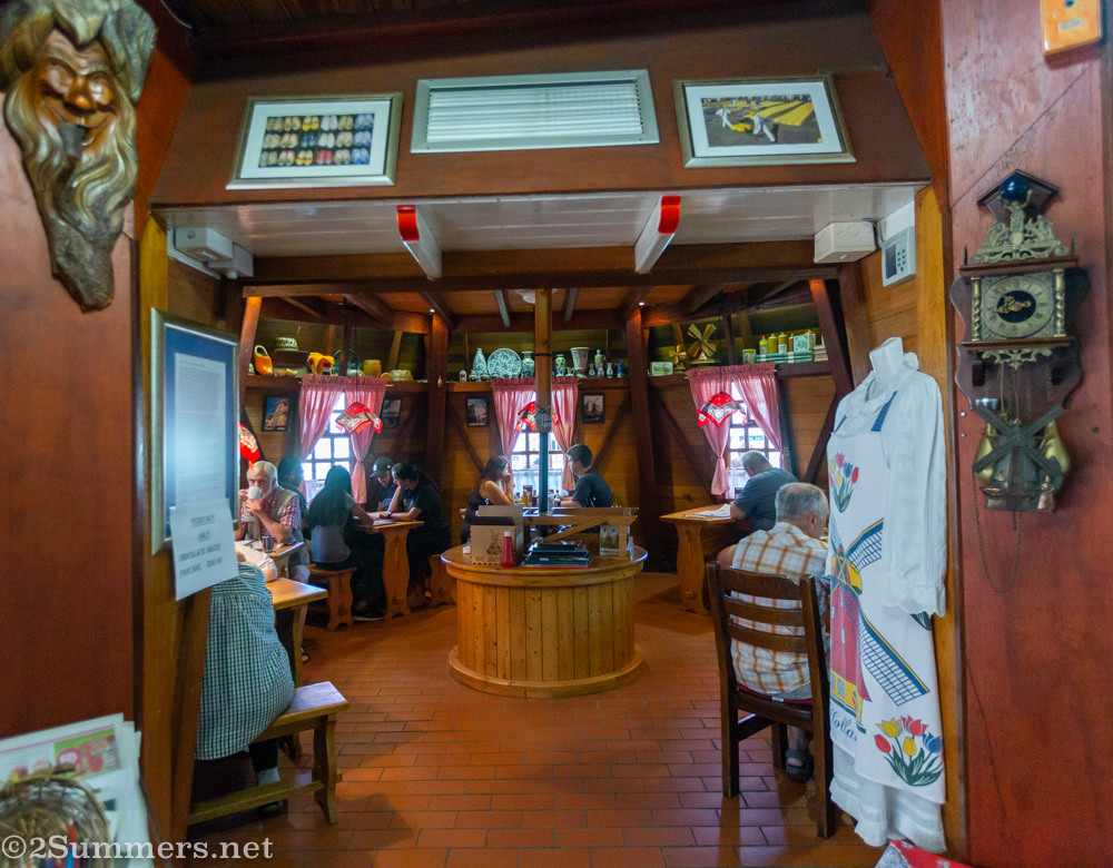 In the 1990s De Backery’s owners looked into commissioning a neon sign shaped like a windmill but eventually decided to build an actual windmill instead – a 3/4-sized replica of the Zeldenrust windmill in Gronigen, Holland. That’s when De Molen (“the Windmill”) Pancake House was born, inside the windmill on top of De Backery. The vanes even turn when there are no customers on the balcony.