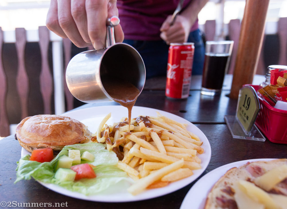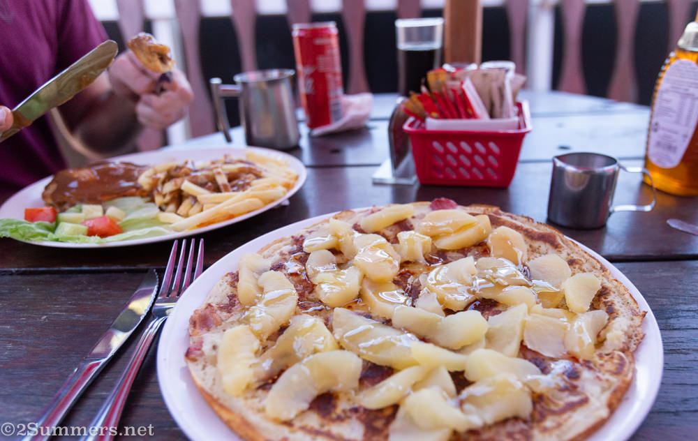 I had the Dutch apple pancake with bacon, topped with honey.Kevin’s breakfast: steak pie and chips with gravy. Also delicious.