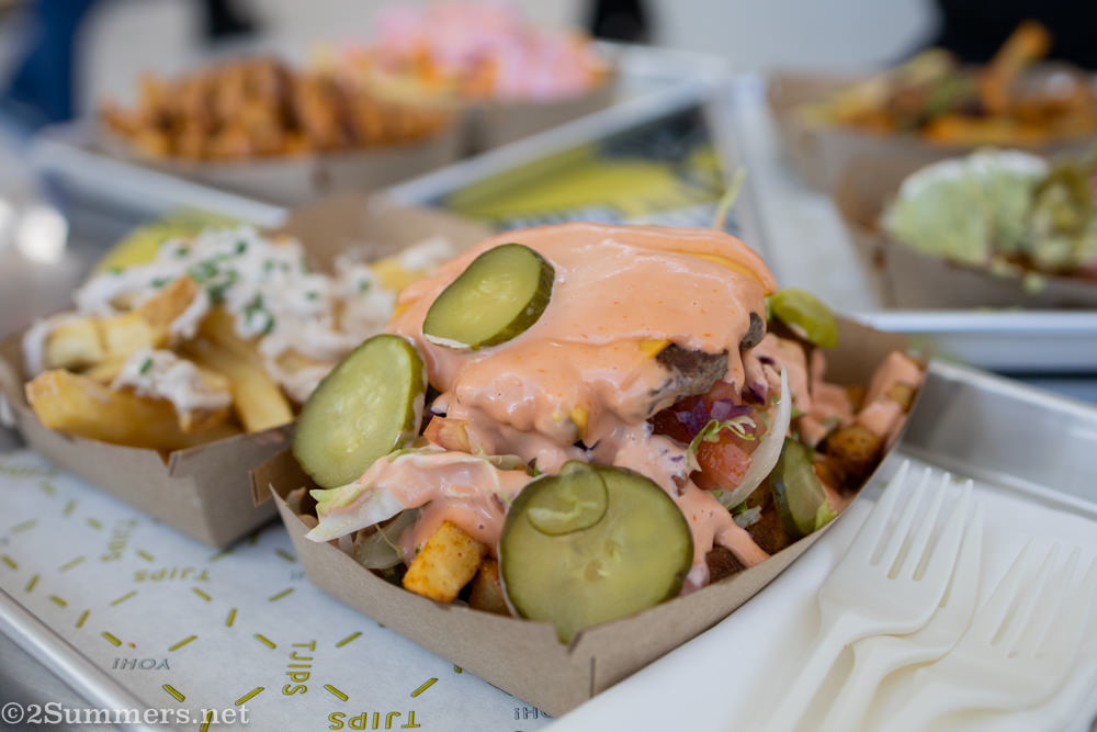 The first round: truffle chips (bottom left), chips topped with buffalo wings (top left), and the "El Supremo" chips with guacamole, sour cream, salsa, and jalapeños.Closeup of the chips and wings. I loved the sauce and seasoning on this dish."The Joburger": A gourmet cheeseburger over chips. The sauce a classic pink sauce, popular on South African burgers.Saucy chips: One order served with Thai peanut sauce and curry ketchup, one with pink garlic mayo and sriracha mayo.