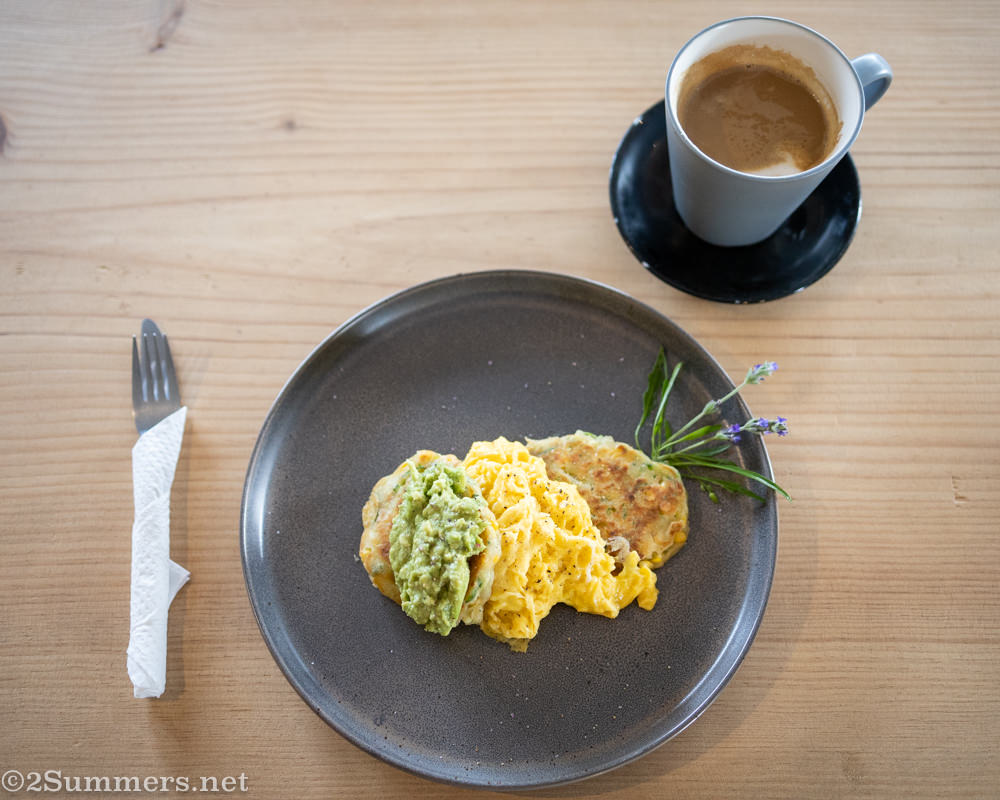 Tulip Coffee Bar, where locals go for coffee and breakfast in Hermanus.Zucchini, spinach, and corn fritters topped with avocado and scrambled egg. I cannot explain how good this meal tasted.