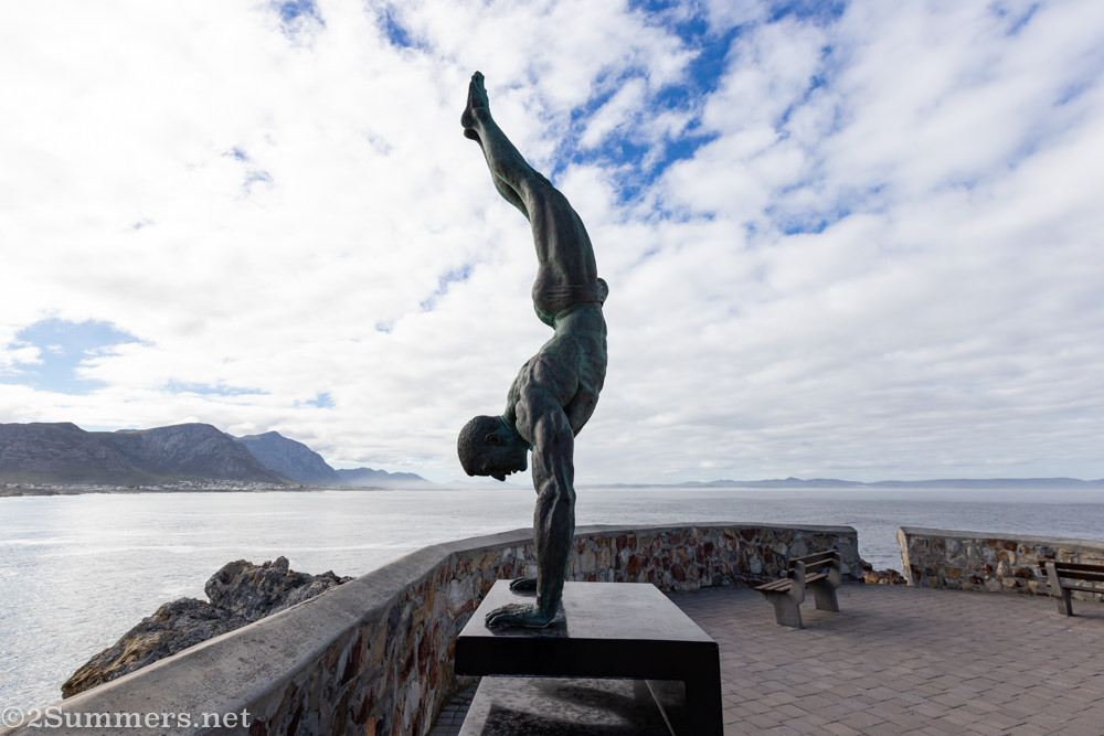 The Whale House is a fairly interesting and informative museum about whales. It has some nice exhibits and costs R20 (about $1.50) to get in.A full-sized southern right whale skeleton inside the Whale House.The World War I Memorial, part of the Old Harbour’s open-air museum along the water.A beautiful sculpture by Marieke Prinsloo-Rowe on display near the Old Harbour. This is the start of the famous Hermanus Cliff Path and there are sculptures like this all along it – the rotating exhibition is part of the annual Hermanus FynArts Festival.