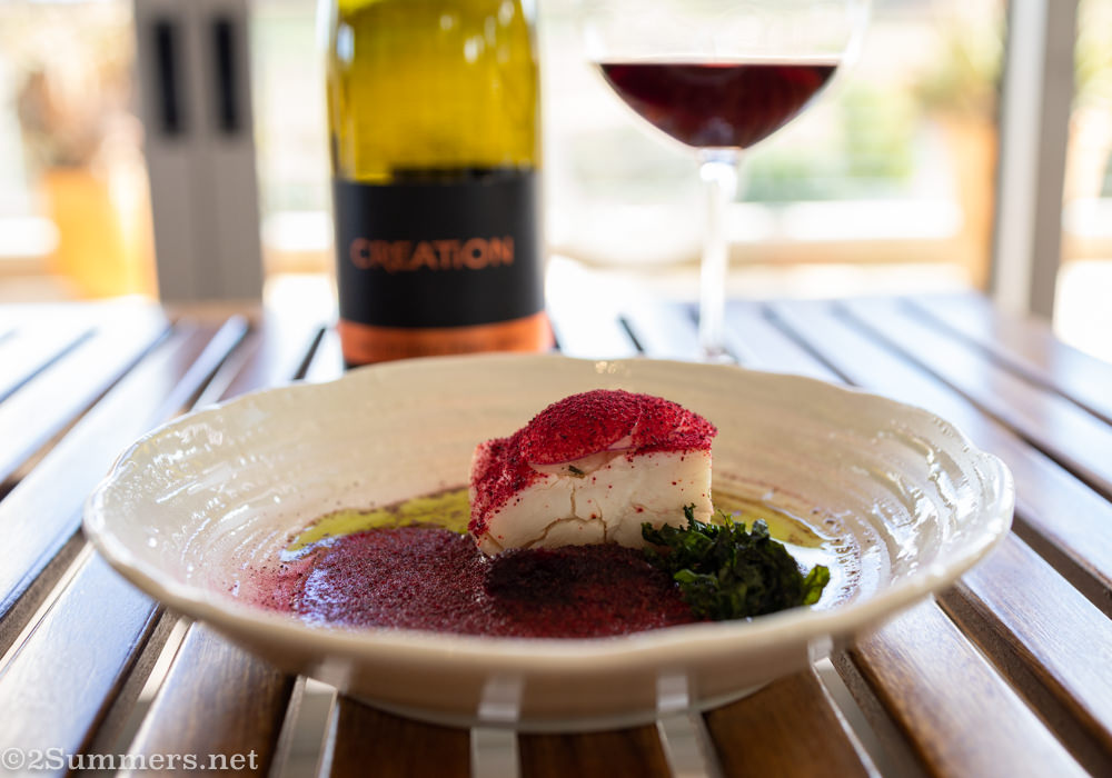 Through some magical fluke I scored a six-course lunch and wine pairing at Creation Wines in Hemel-en-Aarde, about a 20-minute drive from downtown Hermanus. Creation is known for its innovative food and wine pairings and has just released its 2019 winter menu, called the FynArts Story of Creation.