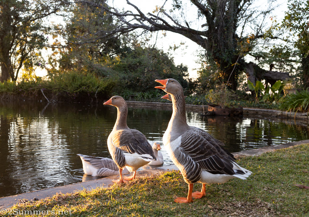 The main house – home to Ess, Tana, Bridget, and many others in the Tooley/Hilton-Barber clan over the past 100 years or so. There was no electricity here when Bridget was a child. Today the house comprises Kings Walden’s reception area, kitchen, lounge, and dining room.Family photos.Bridget in the garden with her beloved flock of geese.More than 30 years ago this tree was struck by lightning and died, on a winter night when lightning strikes are exceedingly rare. It happened to be the night when Ess Tooley died. Somehow the tree is still standing and has become a totem for Kings Walden.The beautiful hotel lounge.My room. The photos I took don’t properly convey how nice Kings Walden’s guest rooms are – they are so cozy, luxurious, and understated, with just the right amount of personal touch. You can tell Kings Walden is run by a travel writer with lots of experience staying in hotels.Chef Lizzie Phokungwana.Dinner at Kings Walden. Lizzie’s food is spectacular and the restaurant is open to non-guests.Breakfast.Kings Walden’s massive garden is its best feature, filled with ponds and fountains and lion statues (Tana’s favorite) – each with its own story. The garden is dotted with hidden memorials to various Kings Walden family members and friends who have died, some tragically. Exploring the garden with Bridget is a special experience.Sunrise.Adorable honking geese at sunrise.The sphinx statue. Everyone who walks by has to rub her boob for good luck.This garden is pure, unadulterated magic, even in winter when very little was in bloom.