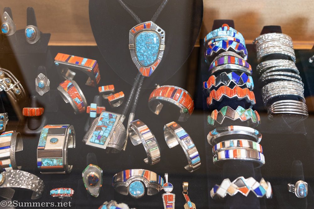 Pam, one of the vendors who periodically sets up shop on Santa Fe’s central plaza. I loved Pam’s jewelry and I loved Pam.Beautiful turquoise jewelry, for sale in shops all over Santa Fe. These bracelets are at Palace Jewellers in Manitou Galleries.The most beautiful array of second-hand cowboy boots at Kowboys. I wanted some so badly but alas, no space in my bag.Joey Palombi, a.k.a. The Scareb, head of rock-cutting at Santa Fe Stoneworks. Santa Fe Stoneworks sells knives, jewelry, and other decorative items made from local semiprecious stone, wood, and bone. My friends and I had such a good time there.Stone-cutting in progress – this is a piece of lapis lazuli.A few of the end results.