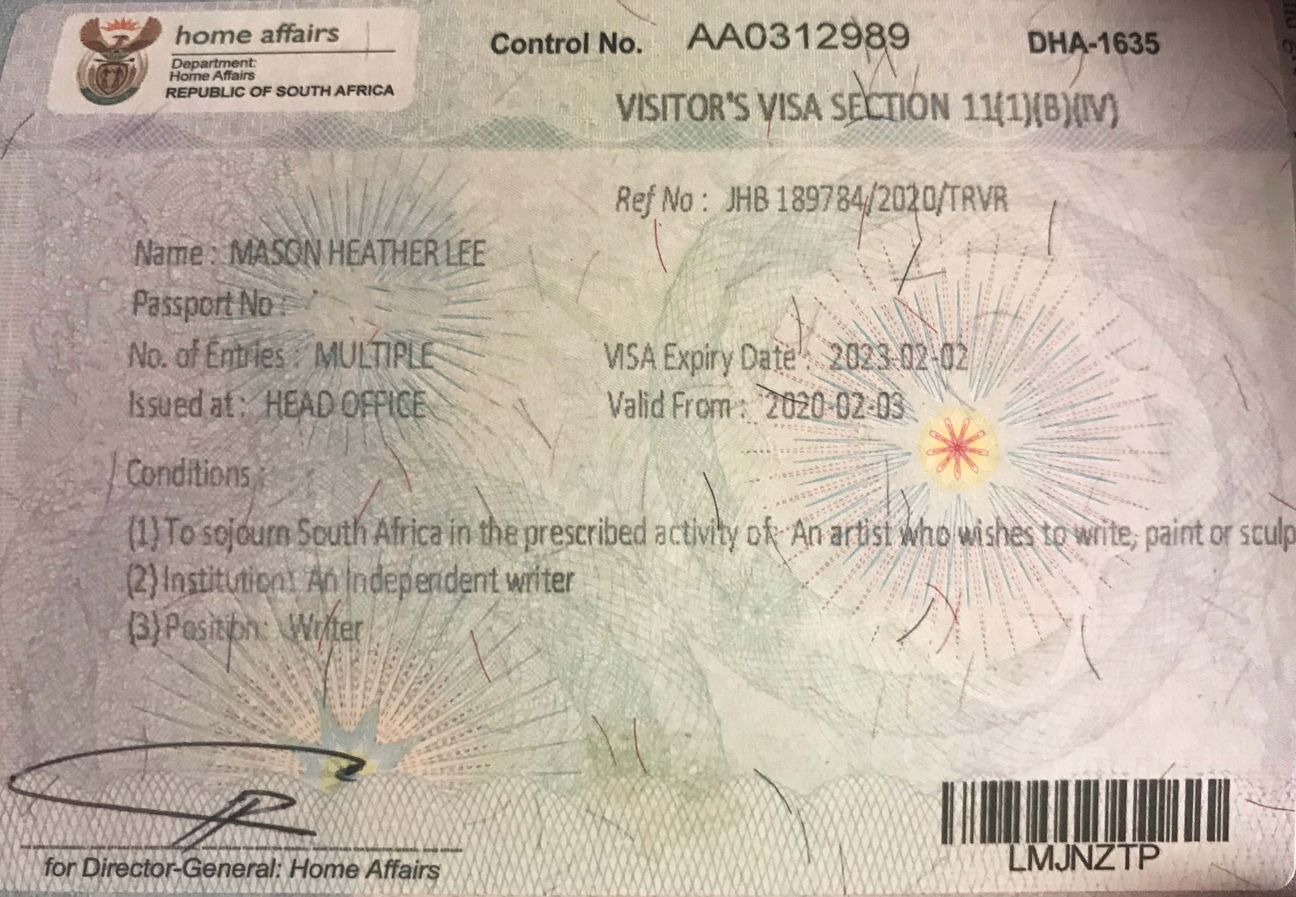 I am the only person I know who has this visa. I can’t find information about the artist’s visa on the South African Department of Home Affairs (DHA) website, although various private immigration companies mention it on their sites.