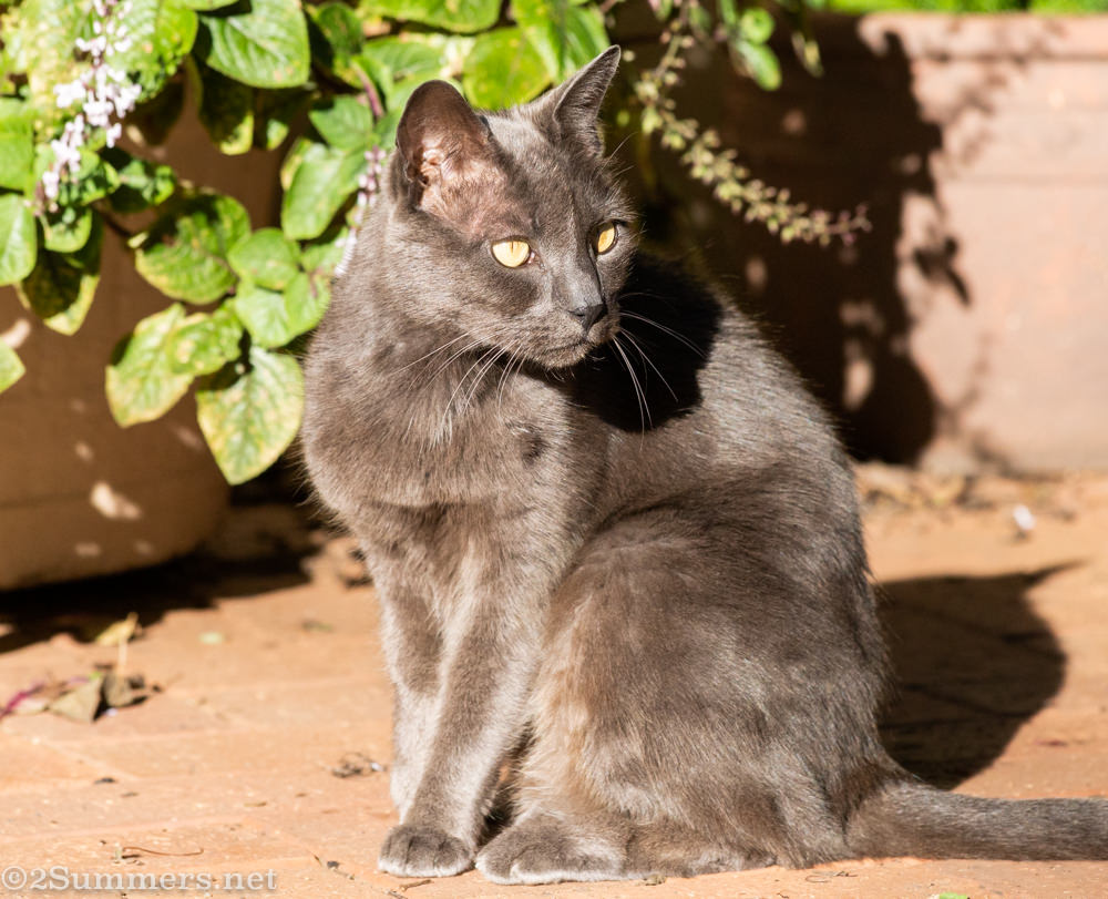 Here I am sunning myself at 4:30 this afternoon, as I do every afternoon for exactly 12 minutes, assuming the sun is shining.Here I am on the patio at 4:45, licking my nearly toothless gums and awaiting my dinner.