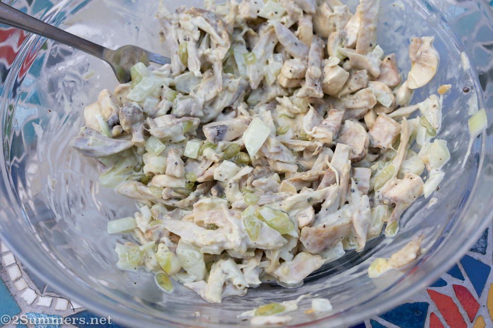 I added the first horned melon to a makeshift chicken salad (South Africans would call it “chicken mayo”) that I made with some leftover chicken thighs. I did my best to scoop the seeds and pulp out with a spoon and stirred them into the salad. This worked very well – the melon has a tangy flavor that worked perfectly in the salad.