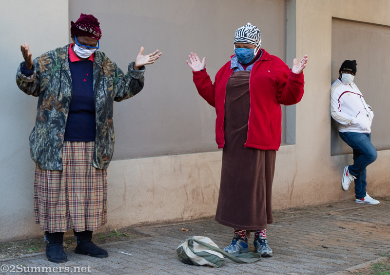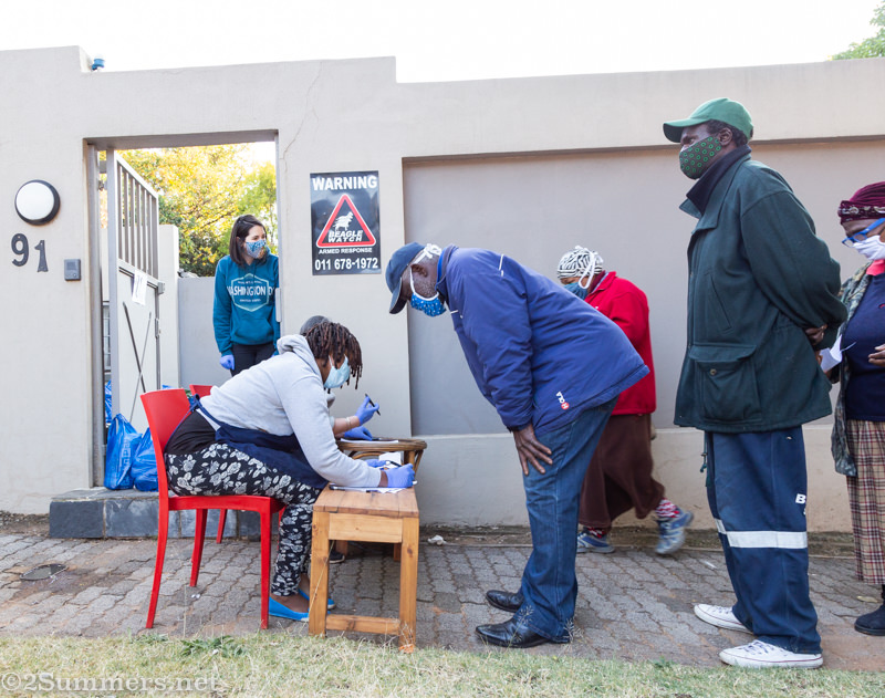 Volunteers, ready to work.Tanya giving instructions.A man waiting. It simply wasn’t possible to really talk to people or even get their names. For the foreseeable future, my normal process for collecting people’s stories is going to be hampered by masks and social distancing.A prayer before the distribution begins.First in line.Each person handed in their ticket and then Mbali and Tanya checked the numbers off a list.Sanitizing before the parcel handoff.Style.Each parcel consists of three bags of food. I found myself worrying about the gogos (grandmas) having to carry home such a heavy load. I expressed my concern to this lady and she laughed. "Eish, I don’t mind," she said. "It’s much better than nothing."The line was broken into two groups to help things move faster.So much mask fashion.