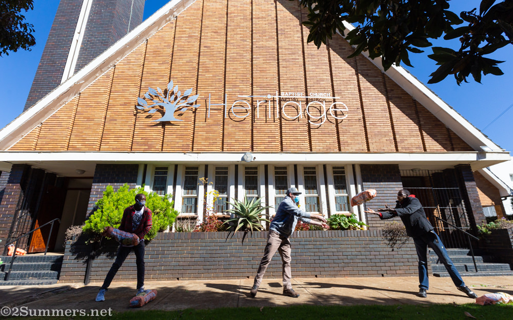 My first stop was the Heritage Baptist Church – one of Melville’s prettiest churches at the top of the hill on 7th Avenue, right next to the Melville Koppies – where my volunteer friends were packing food parcels for distribution tomorrow.