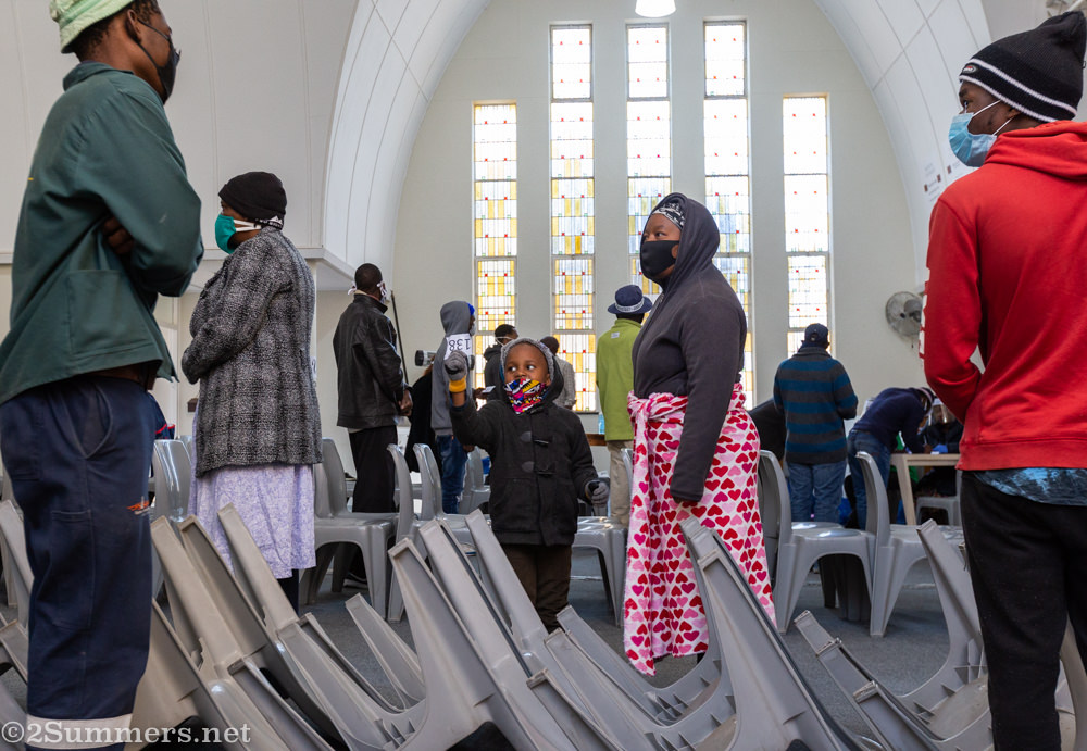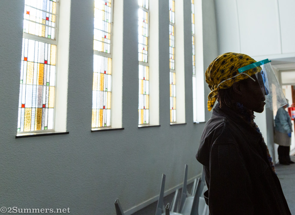 Tanya, the leader.Mbali.The other Mbali (right). It was freezing cold so three volunteers spent the morning distributing coffee to people in line.Another coffee lady whose name I never got.Maarten, whose outfit matched the stained glass.Siboniso (right), Samuel (center), and a man whose name I have forgotten. (Someone help me.) It was great to see a few more faces today, thanks to these clear face shields.