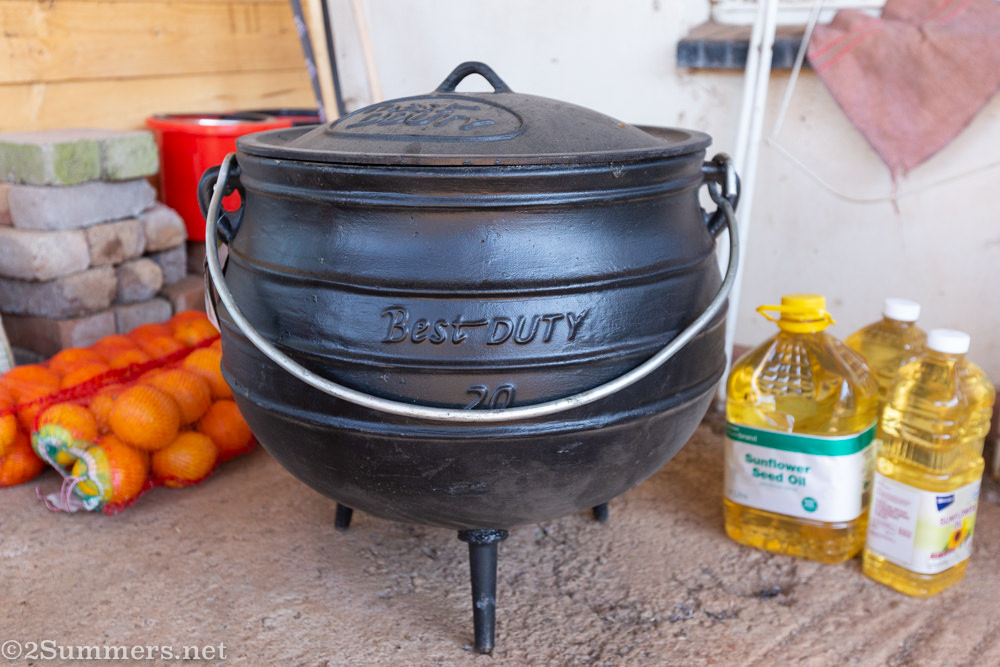 In case the non-South-Africans among you are wondering what a potjie (pronounced POY-kee) pot looks like. Potjiekos (the plural of potjie) are almost always cooked over an open fire – hence the need for legs on the pot.