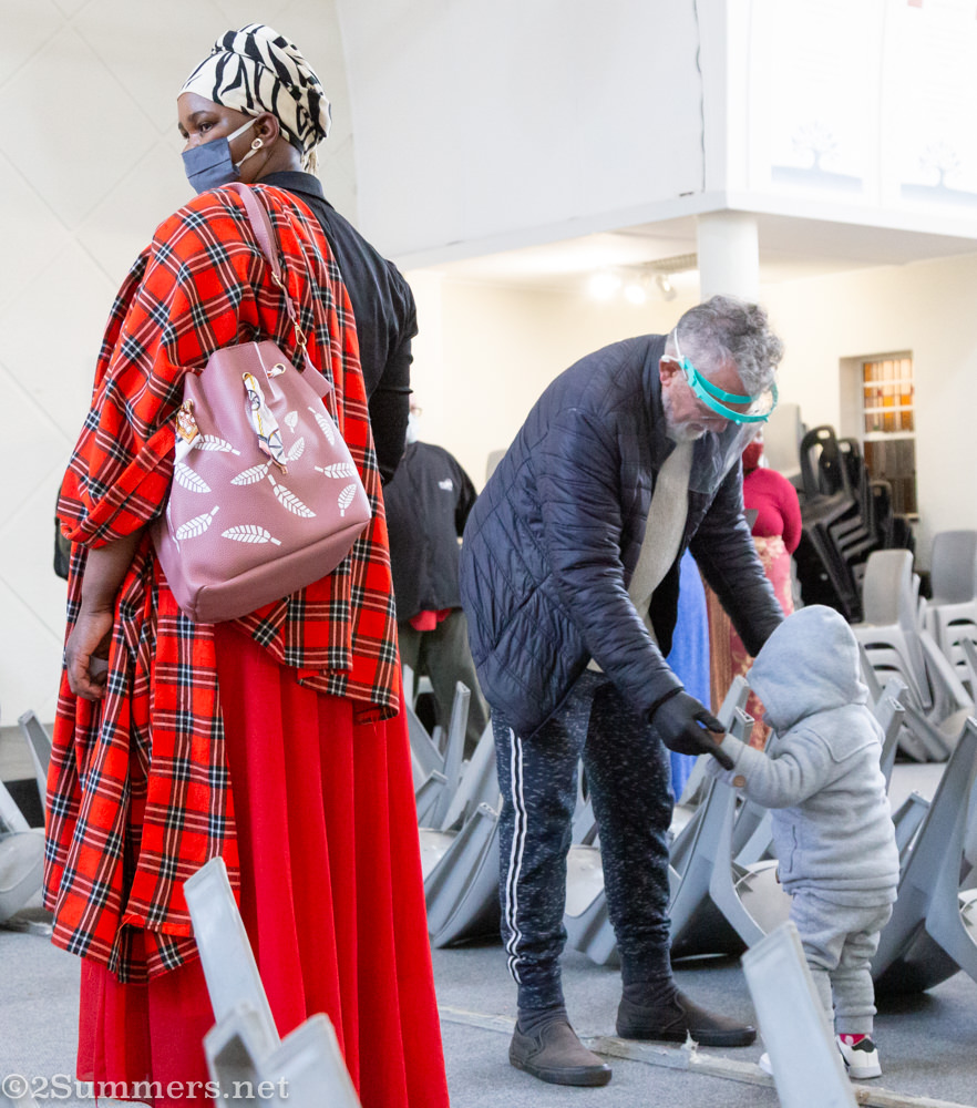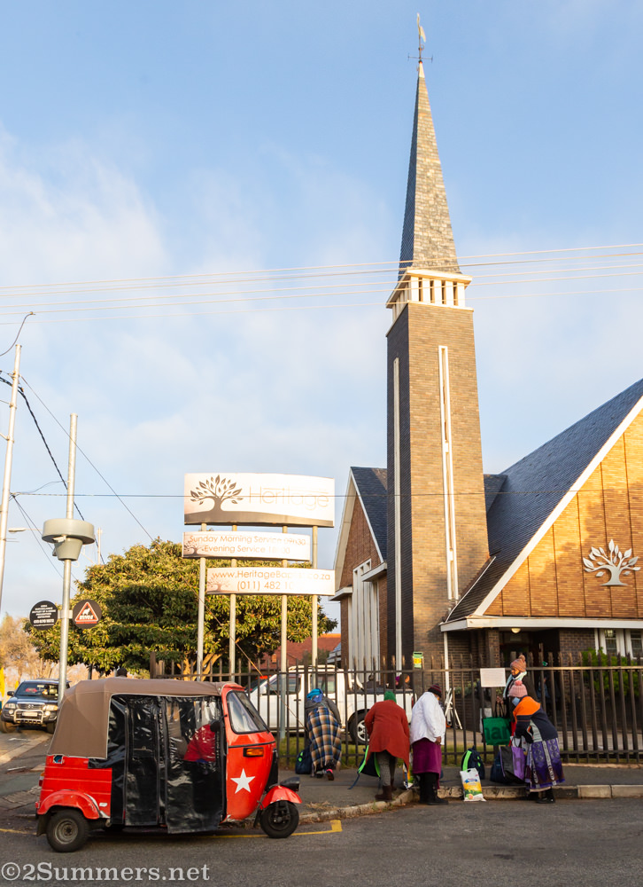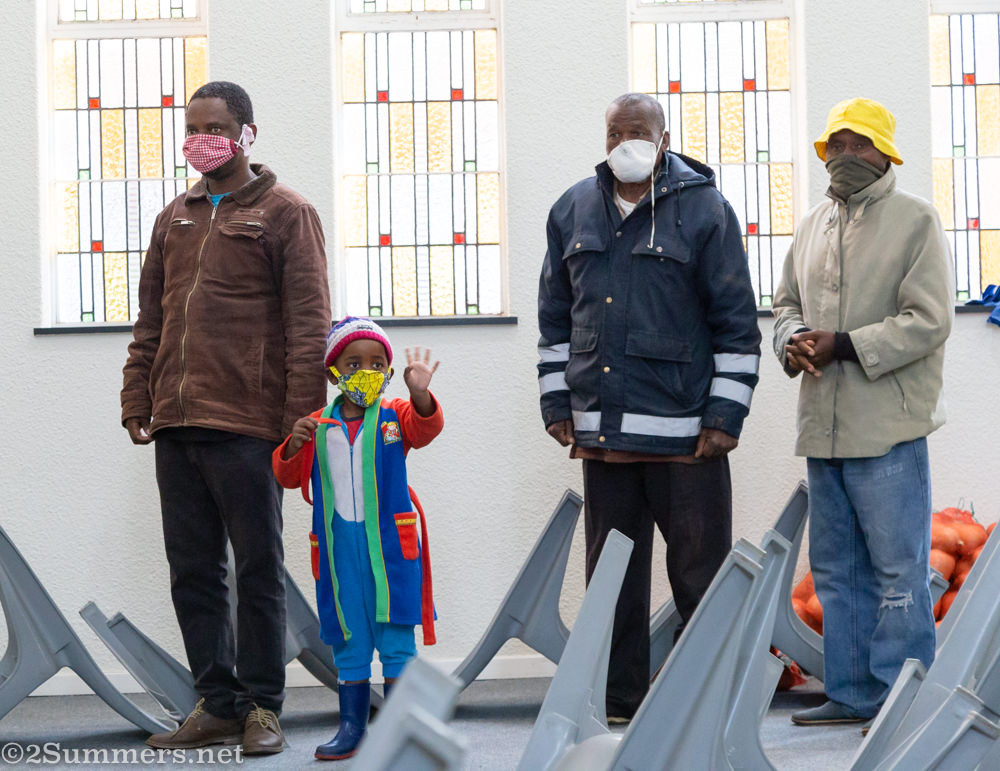 Veggies ready to be packed, with the bags waiting behind.Oranges.Volunteers ready to work. If you live in Melville, you might recognize some of these guys – they are bead artists/artisans who sell their work on 7th Street.Samuel was the first 7th Street artist I met when I moved to Joburg ten years ago. He once made a beaded version of my sister’s dog, which still sits on her mantel in Vermont. Samuel now focuses mostly leather goods and made this beautiful leather bag for Tanya, who runs the food parcel program. You can contact Samuel at +27-78-738-5957.At the church this morning. Dear god, it was cold.I never get tired of taking pictures inside this church.The lady on the right is holding a hot water bottle – best way to cope with this cold.I need to learn this little boy’s name – I’ve seen him at the collection almost every week.Volunteer Nicholas distracts another child while his/her mother waits in line.This kid was freaking cute.Seeing this made me happy.