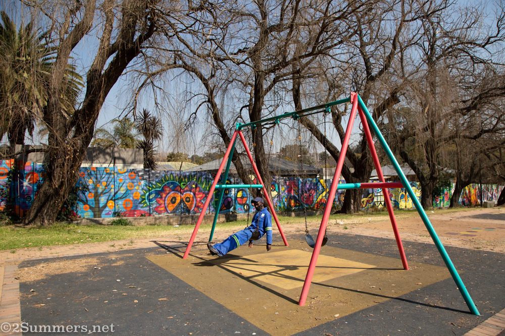 A Joburg city worker enjoys the swing set in Short Road Park. (It was lunch time.)Walking across a bridge in Paterson Park (which is currently closed to the public until the upgrades are complete). Unfortunately it’s winter in Joburg, when the grass and leaves are brown and the light is flat, especially at midday. I look forward to going back in summer when everything is green again.These benches, carved from a massive dead fig tree, are part of the Art My Jozi installations.Beautiful metal tree sculptures formed from hundreds of hand prints.There are a couple of silver hand prints on the branches (the rest are intentionally rusted). The sun happened to shine just right on one pair.This interesting sculpture on the fence along both sides of Paterson Road is still in progress. It was inspired by a theatre performance called "Birds of the Grove".I saw this mural, portraying different South African birds and their quirky calls, in a photo on the JDA Facebook page a couple of weeks ago. I was instantly enchanted. It was fun to see it in person.The swimming pool looks ready to dive into (if it weren’t the middle of winter during a global pandemic).A flock of geese on the side of the new community center.Another bird mural on the wall of the community center. Laurice’s hard hat matched it perfectly.