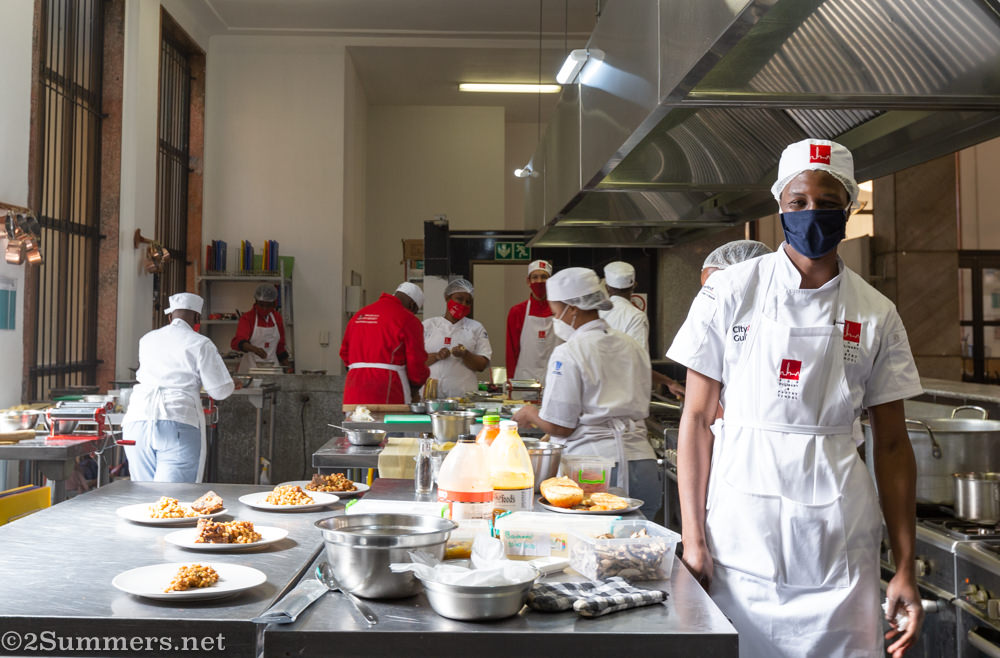 Students hard at work in the kitchen. The school is open to the public for breakfast and lunch.Chef Bulelwa.