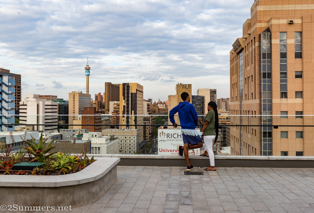 View to the south: Braamfontein at rush hour, Mandela Bridge, train tracks…one of my favorite Joburg views.View to the east: Central Braamfontein and Hillbrow.View to the northeast.More students enjoying the view.Looking across the roof deck, which surrounds a central atrium.I’m getting redundant now but who cares.