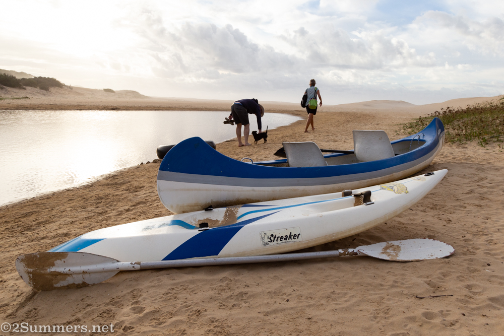 Our stay in Kenton-on-Sea, another tiny beach town with a romantic-sounding name, was also very short. We arrived at lunch-time and left the next morning after breakfast. But we spent a lovely evening at the quirky Woodlands Cottages and Backpackers, a collection of log cabins near the mouth of the Boesmans River. (There are so many rivers on Route 72.)
