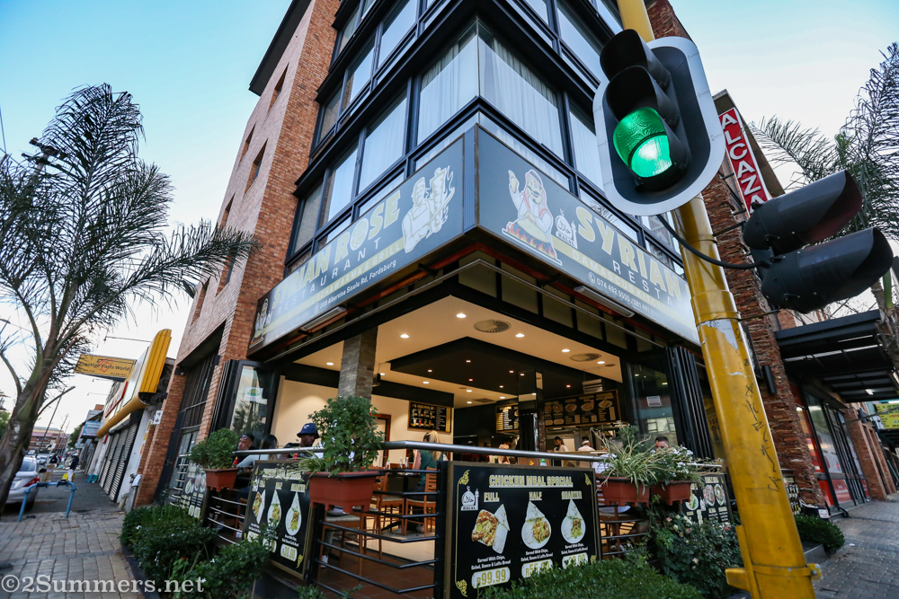 Syrian Rose, at the corner of Albertina Sisulu Road and Mint Road, is across the street from the Fordsburg Market. It’s a busy part of town but we easily found parking on the east side of Mint Road, less than a block from the restaurant.Syrian Rose by night.