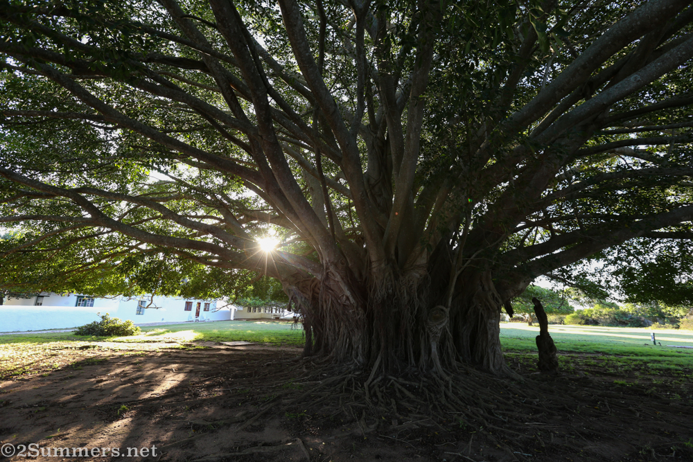 The Cloete Suite, where we spent two simple but luxurious nights. De Hoop offers a big range of accommodation options in all price ranges; the rate for our suite is R2900 (about $185) per person per night for a three-course dinner, bed, and breakfast.Thorsten relaxing on the stoep.Bontebok grazing, with the De Hoop staff housing and huge coastal dunes in the background. The bontebok is a rare antelope indigenous only to the Western Cape; there are tons of them around De Hoop, along with a large herd of eland and numerous ostrich families.Another pretty building.Thorsten made great sketches of the buildings at De Hoop.It’s difficult to capture these fig trees on camera, even with a wide-angle lens, as they are so freaking huge.Thorsten’s fig tree interpretation.
