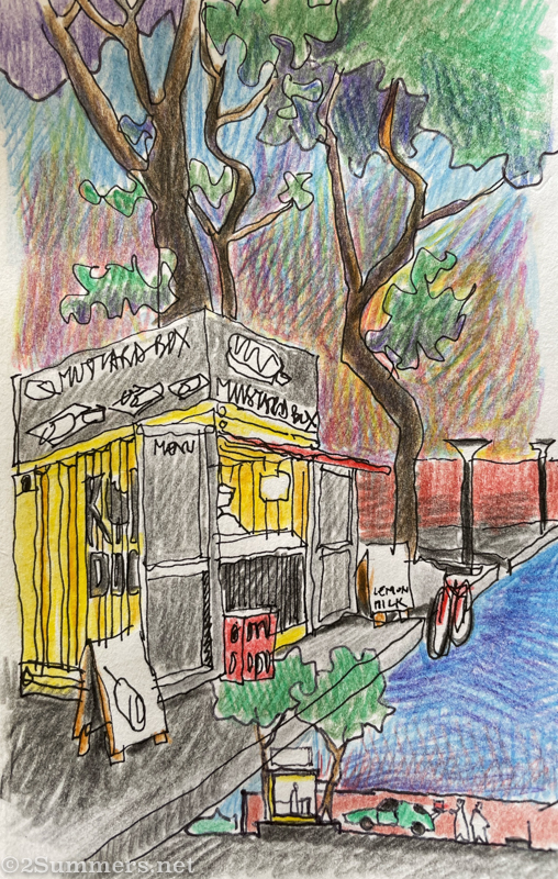 Mustardbox at sunset.Thorsten’s Mustardbox sketch, which I love so much more than any of my photos. Note the tiny green car sketch at the bottom; there was an über-cool gang of East Rand bros eating their corn dogs off the spoiler of a lime-green Porche. For some stupid reason I neglected to photograph that. (See more of Thorsten’s sketches at @thethinking_hand.)Three of the bros ordering before the fourth guy pulled up with the green Porche.
