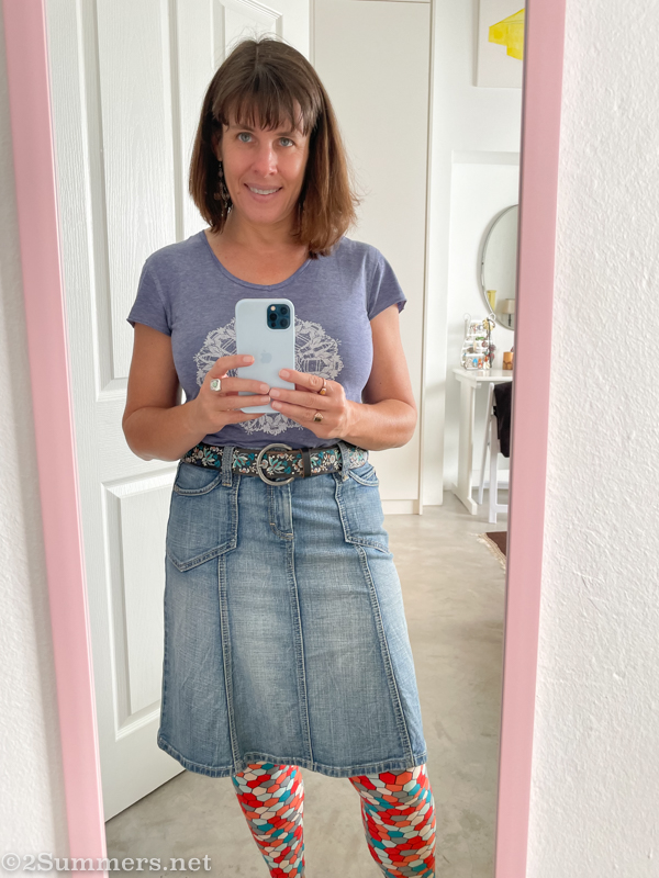 I hadn’t planned to buy anything. But I spotted an A-line denim skirt by Esprit, probably from the 90s, and remembered I’ve been wearing the same Eddie Bauer denim skirt for at least two decades and it’s starting to fall apart. Then I spotted the huge rack of unworn LuLaRoe leggings, in a blinding kaleidoscope of colors and patterns, for R40 each.